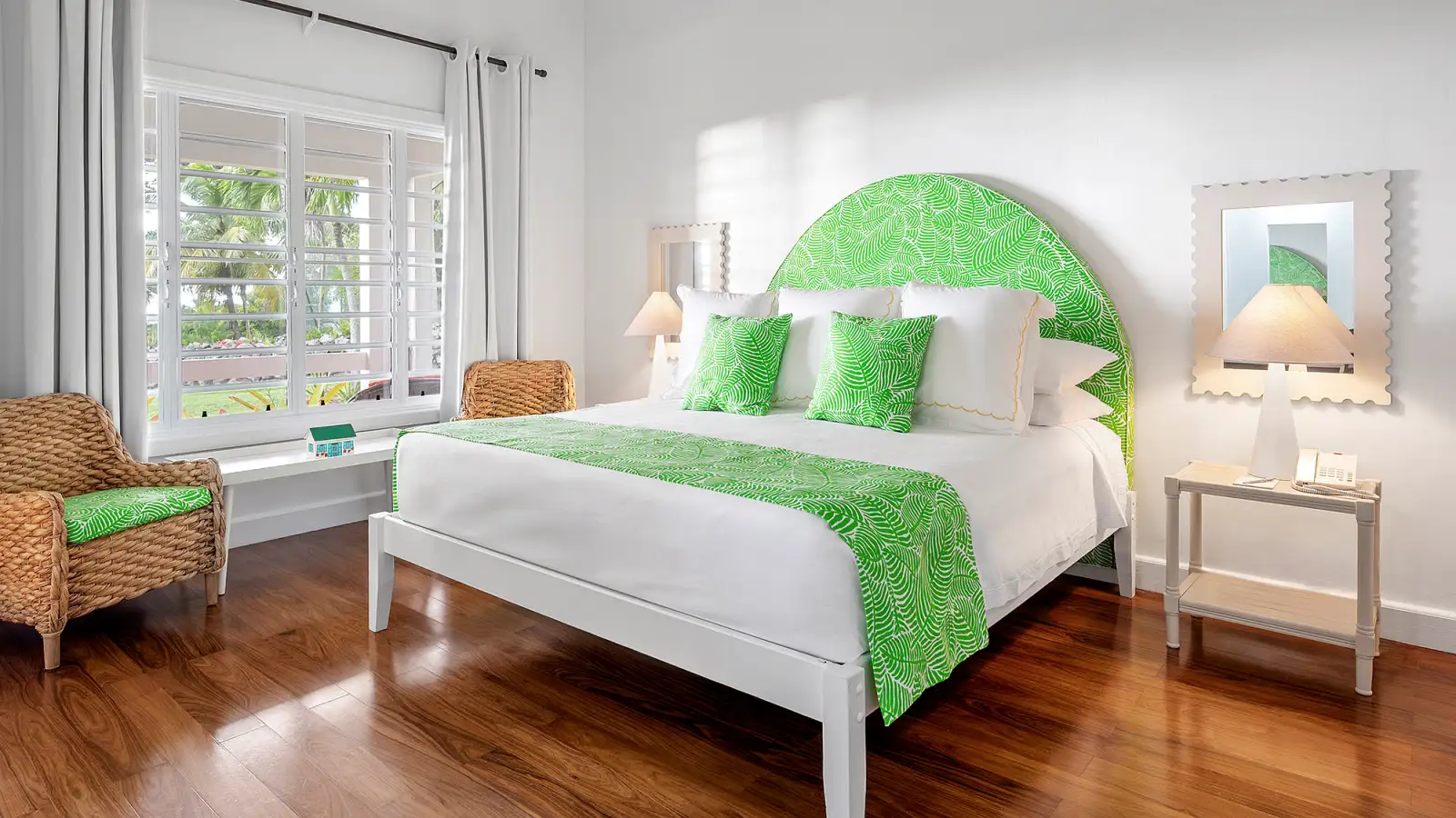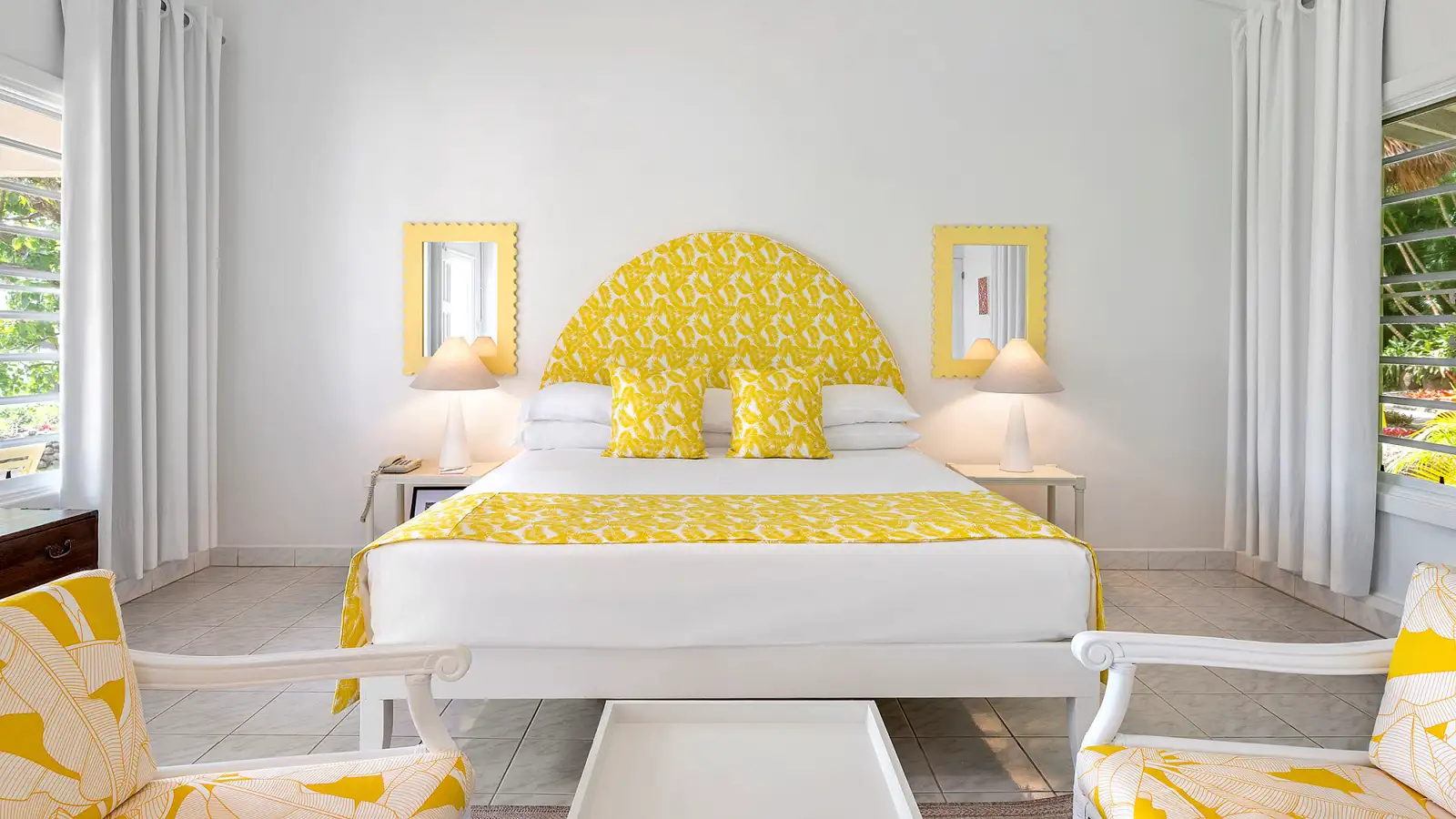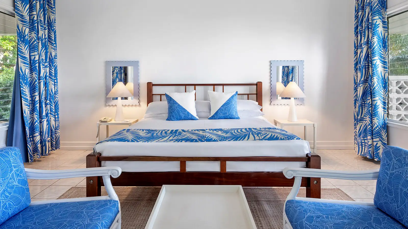 The Signature Rooms are bright and characterful, defined by high ceilings, white-painted beams, and generous windows that draw in light and views across the gardens and out to the sea beyond. Confident colour and graphic textiles bring energy to each space, set against crisp walls and classic furnishings. Open verandas extend the rooms outdoors, creating an easy flow between interior living and the surrounding landscape.