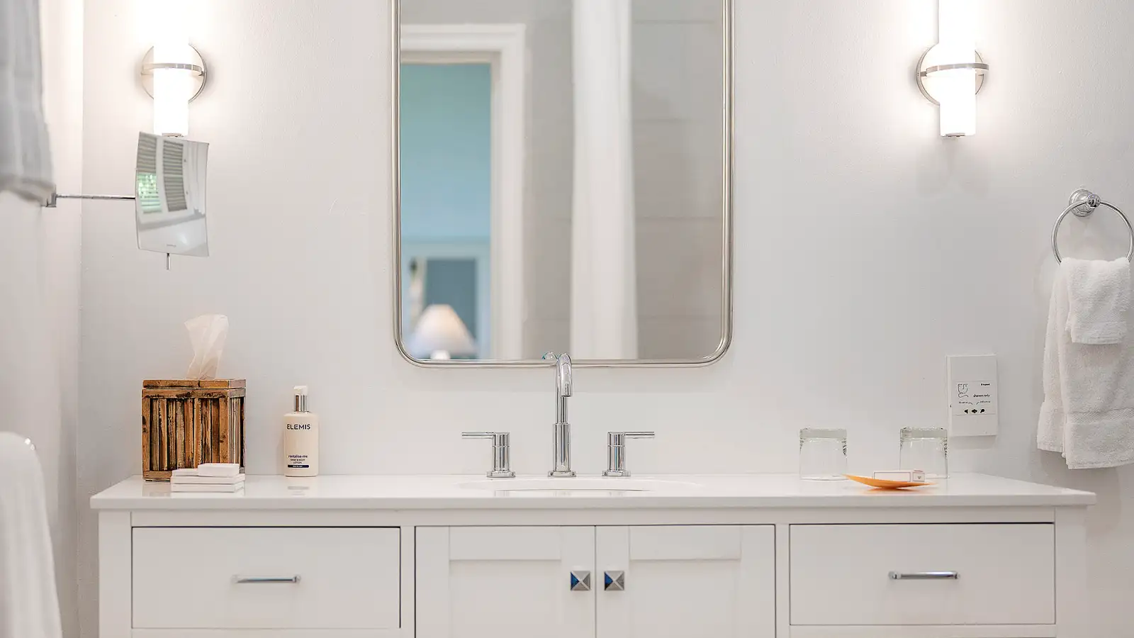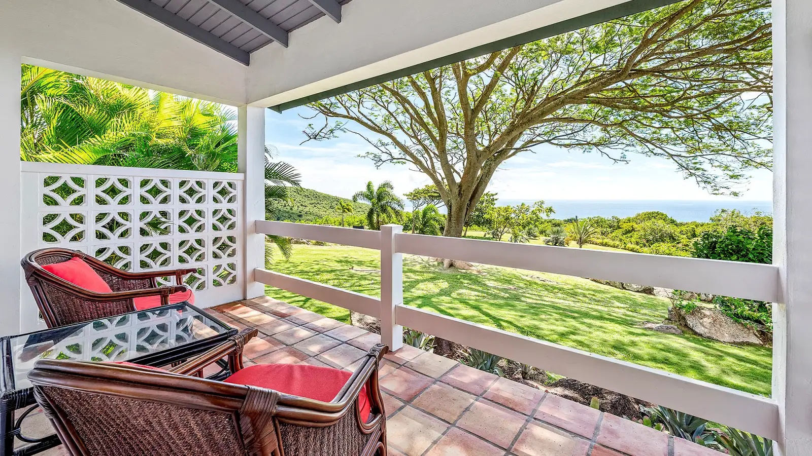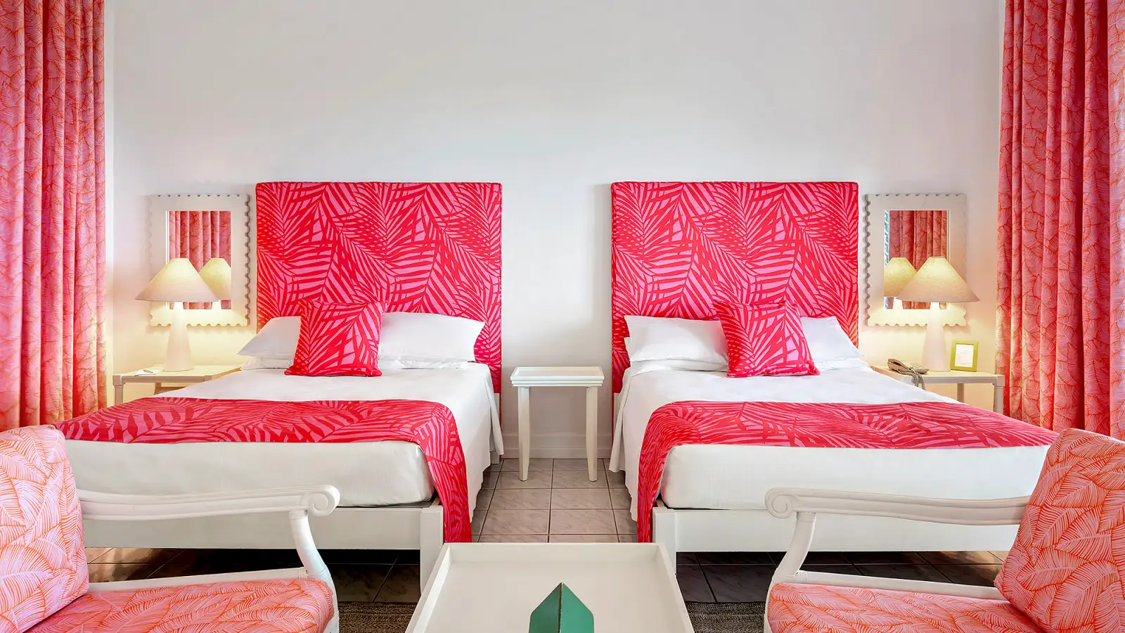 The Signature Rooms are bright and characterful, defined by high ceilings, white-painted beams, and generous windows that draw in light and views across the gardens and out to the sea beyond. Confident colour and graphic textiles bring energy to each space, set against crisp walls and classic furnishings. Open verandas extend the rooms outdoors, creating an easy flow between interior living and the surrounding landscape.